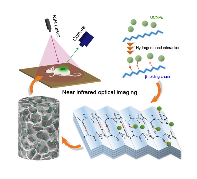 通过从介观尺度将稀土上转换纳米颗粒均匀地组装到丝素蛋白生物支架,使其具备在近红外激发下产生可见光波段发射光的上转换荧光性能。该团队使用低功率连续980 nm波长的近红外激光穿透大鼠皮肤和组织、激发植入的蚕丝丝素生物支架,产生可见光(绿光)图像。揭示了蚕丝生物支架的生物相容性、力学性能和生物降解性,以及组织细胞与生物支架的相互作用。丝素蛋白生物支架是一种软物质,上转换荧光技术为体内软物质成像提供了新思路。