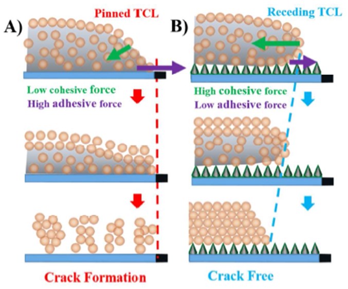 在该研究中,作者基于以上的研究现状,以纳米针状的超疏水表面为基底,来改善胶体小球的自组装,可以减少甚至消除大尺度的裂纹的效果 (图1)。当在低粘附力的超疏水基底上自组装时,胶体悬浮液在水分蒸发过程中呈现出气固液三相线的连续后退移动的变化。不断后移的三相线和胶体小球适度的变形可以保持胶体小球不受限制的自由收缩。这样可以及时填补因为溶剂蒸发而产生的空缺,并能轻易获得紧密堆积且完美有序的自组装结构。基于该原理,我们最后成功制备出厘米级别无裂纹的光子晶体薄膜。