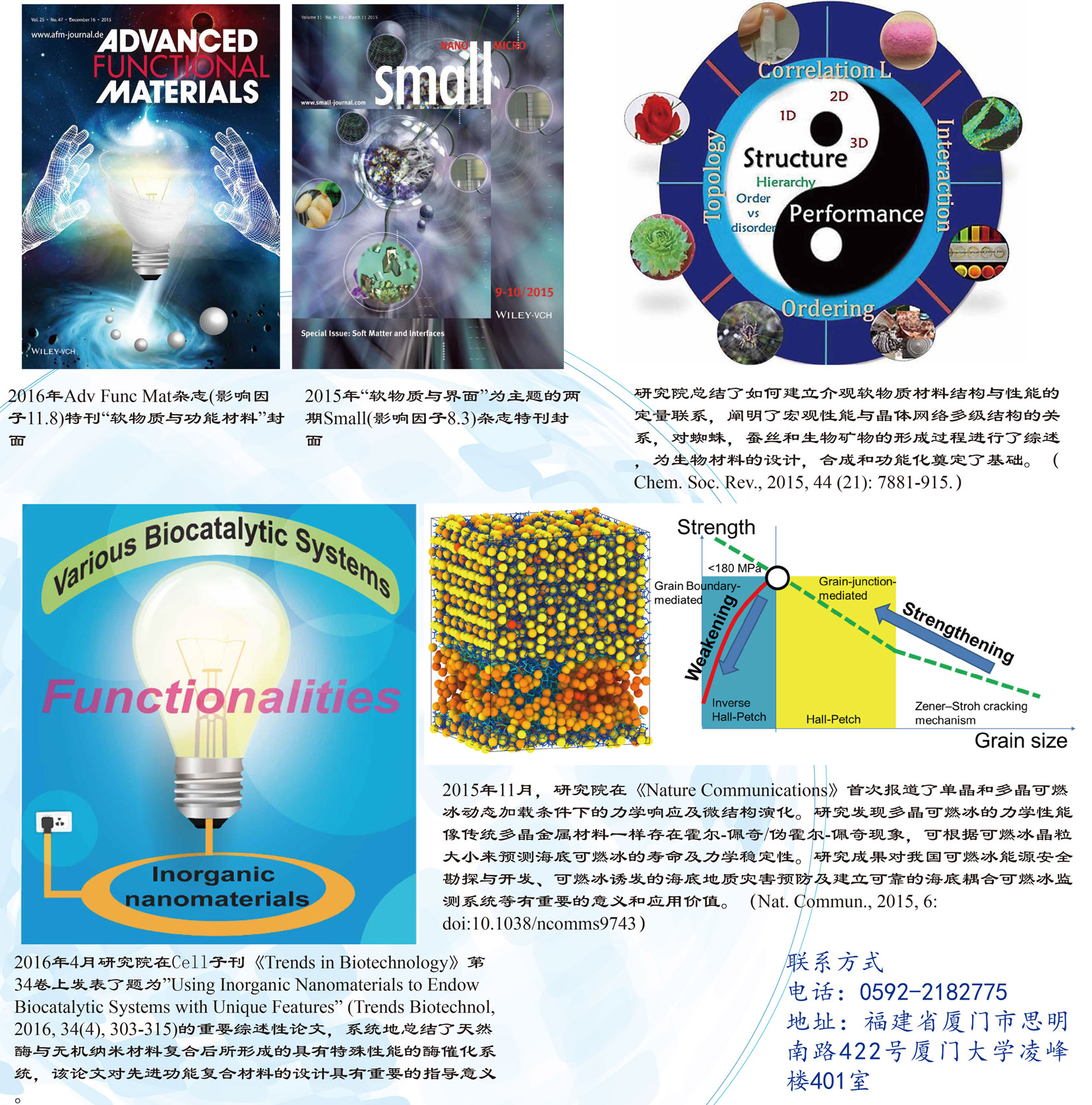 近五年来,已发表柔性物质相关领域的SCI论文共337篇,一区论文179篇,影响因子大于10的一区论文76篇,影响因子大于20的一区论文5篇,影响因子大于30的一区论文3篇,Science/Nature及其子刊3篇,Cell子刊1篇。其中16篇论文入选ESI(EssentialScienceIndicators)近十年全球最有影响力论文(HighlyCitedPaper)。 研究院开启了“厦门软物质论坛”这一倍受国际同行瞩目国际年度论坛。成功地举行了软物质暑期学校。2017年,还将组织软物质研究全国大会。‘’