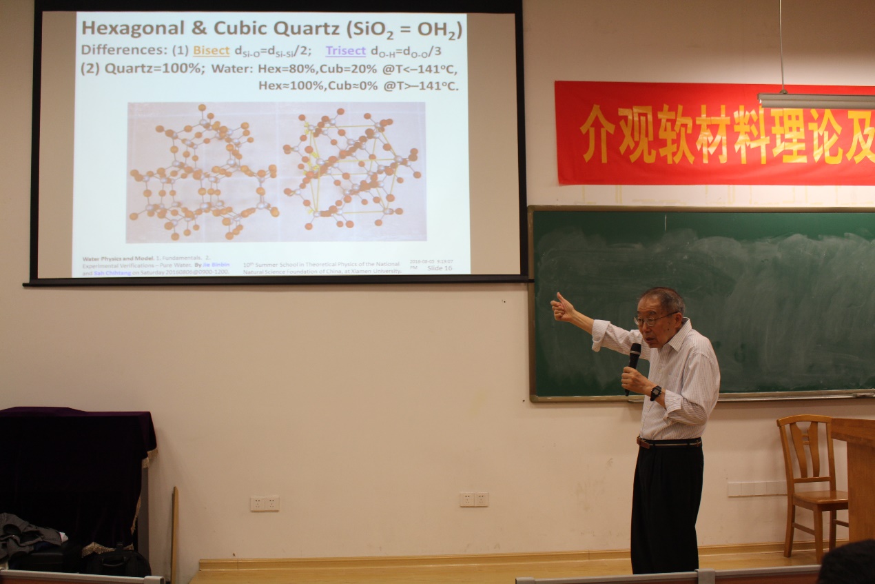 8月6日,美国工程院院士、中科院外籍院士萨支唐教授莅临“福建省柔性功能材料重点实验室”讲学,介绍了纯水的物理学问题和相关模型建立的基本原理。报告从几个方面介绍了萨教授课题组研究的纯水的氧晶格模型,包括可俘获两倍质子的重要性能特征、氧核的振动而非平移、正负质点的平移质子的迁移惯性质量/势能和动量/动能/电磁能、由本征的和非本征的质子化声子辅助的正负质子俘获转移、三次质子俘获传输通道、本征/非本征/谐振声子或非谐振声子这三种参与情况、爱因斯坦声子控制的俘获作用、质子陷阱中自陷的动态Jahn-Teller效应或者质子极化形成、不需在三种声子中最活跃的声子中最深的俘获陷阱进行运输的极化作用、有效的玻恩-奥本海默近似。
