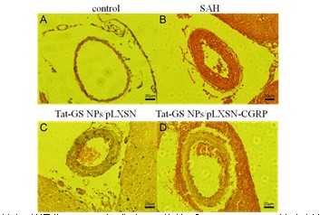 血管痉挛(cerebral vasospasm, CVS)是蛛网膜下腔出血(subarachnoid hemorrhage, SAH)后致死致残的重要原因。为了控制SAH后的CVS发生,我们以具有良好生物相容性、生物降解性以及表面带正电的Tat- GS纳米粒子作为降钙素相关肽基因(pLXSN-CGRP)的载体材料。结果发现Tat-GS能够介导CGRP基因跨过BBB、在脑组织中进行转染;且小鼠在SAH后的血管痉挛程度明显减轻,神经功能也可得到明显改善。