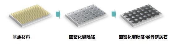 (3)聚吡咯药物芯片的制备。药物芯片是应用微机电技术(MEMS),将微型化、智能化、集成化、可控化的特点整合到药物释放领域中,所开创的新一代药物释放体系。我们将导电聚合物聚吡咯所具有的药物储存释放性能与硅芯片技术相结合,制备出了一种新型的聚吡咯药物芯片。该药物芯片具有药物储存简单、可储存多种药物、药物释放模式多样、细胞相容性好的优点。