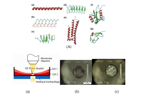 某些生物中,存在着某种具有抗冻功能的蛋白(见图1A)。这些蛋白的抗冻机制,对干细胞的保存,食品保鲜,气候,建筑与航空器结构抗冻,癌症治疗等有着深刻的影响。冻伤是由于水的结冰对细胞造成了影响。抗冻的目的是为了阻止结冰。我们发展了三明治显微结冰技术(图1B(a)),对微纳米级小水滴进行了深刻的研究。我们的结果首次指出,水结晶真正的均相成核是不存在的。结冰必须由水中的水纳米级颗粒的引发,抗抗冻蛋白抗冻机理是由于抗冻蛋白对纳米颗粒界面阻隔结冻引起的。中子衍射实验验证了以上的结果。该结果为仿生结构抗冻指明了方向。