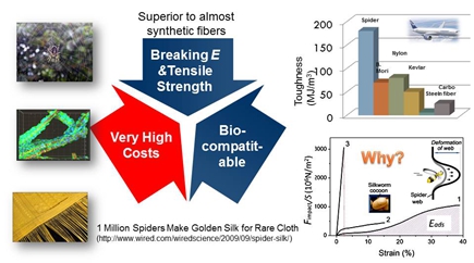 蜘蛛丝是最坚固的纤维之一。有人做估算,一股铅笔粗细的蜘蛛丝,能刹住一架正在飞行中的波音747飞机。另根据我们测定,蜘蛛丝受到冲击时,能吸收巨大冲击的能量,而且不产生巨大的反冲力。因此,蜘蛛丝是最好的能量吸收材料。蜘蛛丝在遇水之时,会产生超收缩,具有很好的自恢复功能,被认为是制造人造肌腱的优良材料。除此之外,蜘蛛丝蚕丝具有很好的生物相容性,为优秀生物医用材科。目前,蚕丝正被应用于研制生物医用支架,缝合线,人造皮肤。我们的研究表明,蜘蛛丝蚕丝是由20~30纳米丝原纤组成。原纤内则是由beta纳米晶体与分子链组成的纳米晶体网络。蜘蛛丝的高晶粒密度,良好的晶有序度,是其高強度的结构成因。除此之外,其独有的分子内beta折叠结构,是其延长性与吸能特性的主要因素之一。
