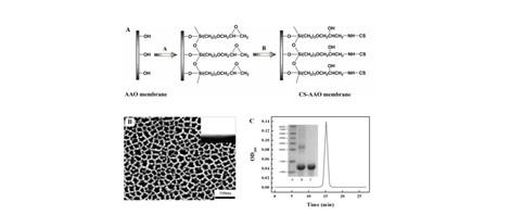 (2)较低的亲和容量是制约亲和分离效率的瓶颈问题之一,通过对吸附机理的分析,将导电聚合物引入亲和领域,构建了一种既含有配基又具有导电性能的膜,并将之命名为“affinity electromembrane”(“亲和导电膜”)。该膜不仅可通过共价键偶联配基,还可通过掺杂方式实现配基的固载,极大的简化了亲和膜的制备过程。更为有趣的是,在微小的电刺激下该膜的亲和容量显著增强,极大的提高了亲和效率,该法有望成为复杂生物组分高效纯化的新型技术手段。