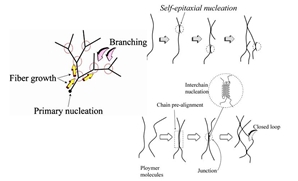 图3.三种“节点”的产生机制:(a)通过尖端结晶学失配成核,产生尖端分叉;(b)通过侧面结晶学失配成核,产生侧面分叉;(c)通过聚合物分子链间结晶,产生分子链间融合。