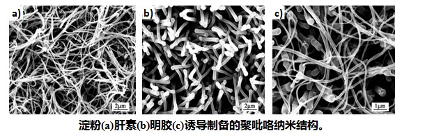 (1)以生物分子作为形貌诱导剂制备导电高分子纳米材料。与其它常规形貌诱导剂相比,采用生物分子作为形貌诱导剂制备导电高分子材料具有绿色环保、成本低、合成方法简单并且可将生物分子的独特性能赋予导电高分子纳米材料等优点。自2006年以来,我们先后采用肝素、明胶、淀粉以及ATP为诱导剂制备出了一系列导电高分子纳米材料,由于兼具生物分子与导电高分子的共同优点,该类材料有望作为导电性生物材料在细胞培养、组织再生领域发挥重要作用。