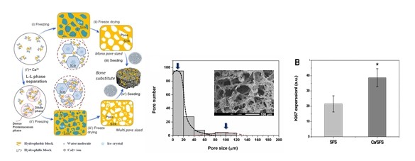 图3.仿生骨再造。以生物材料为基础材料,通过生物仿生技术制造生物医用材料。如此蚕丝为生物材料,具有很好的生物相容性,以及可控的降解速度,可用于制造组织工程支架。由于设计,模仿骨的多级微纳米多孔多级结构,其组织工程支架生物医学活性提高了一倍。