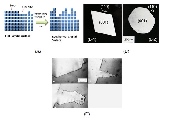 图2.晶体界面粗糙化转变。(A)晶体界面平坦与粗糙示意图。(B)不同温度下,石蜡晶体形貌;(C)生长中的萘晶体。在晶体生长面与固体颗粒接触,由于二维异相成核生长产生更快的生员速率,使接触点的生长速率加快。这就造成晶面突出部的形成。