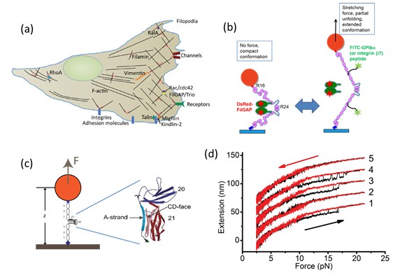 Filamin A、Talin都是这种力学感受蛋白,其功能机制可以通过单分子的手段来研究。蛋白质上拉力的变化会导致其结构的变化,进而影响其与其他分子的相互作用。通过这个机制,细胞把力学信号转化成化学信号,以指导细胞对力学环境产生响应。