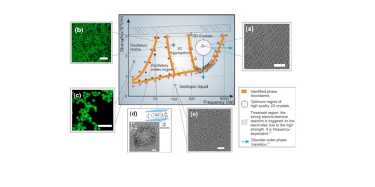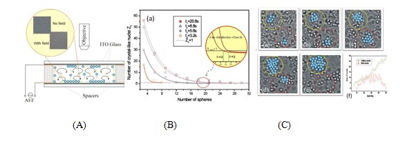 图4. (A)胶体小球在电场的作用下,表现出来的丰富相特性。(B)电场调控的胶体小球结晶实验模拟体系已经用于研究成核,生长,台阶运动,缺陷产生与迁移等重要的结晶动力学过程。