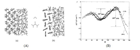 图3. (A)分子动学计算机模拟尿素晶体(001)与(110)固液界面结构。(B)通过对尿素晶体在不同界面的不同取向分布,取得分子在界面上,进入晶体取需跨越的势垒。(C) (a)由我们模型预测的尿素晶体生长习性; (b)由传统PBC理论预测的习性。(D)从水溶液中生长出的尿素晶体的习性。与(C)(a)所示完全一致。