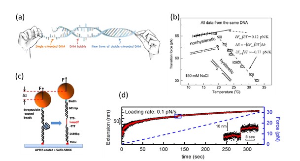 图4.单分子实验对DNA的构象转变的研究。(a) DNA overstretching的过程中在不同的条件下可能出现的三种不同的构象转变:转变成单条单链DNA、DNA泡、新的双链构象S-DNA。(b) DNA发生构象转变时的拉力对温度的依赖关系,从这个温度依赖关系中可以得到DNA构象转变时熵的变化。(c)单分子磁镊对i-motif结构的稳定性的研究的示意图,当足够的拉力施加到i-motif结构上时,它的折叠好结构能够被打开成单链DNA。(d)随着拉力的线性增加,利用高精度磁镊技术,i-motif打开的过程可以被直接观察到。