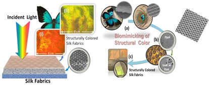 结构色染色-仿蝴蝶翅膀与孔雀羽毛的结构色,该颜色由重复周期决定,无染料,不褪色,且多重反射能使其反射可见光之外,兼有抗紫外与屏蔽红外的功能。通过仿生形成的结构色,不变色、无污染,节约水资源,为下一代的“绿色”着色技术。