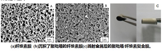 (1)制备出了一种温度敏感的、只能在体温下释放药物的温敏型聚吡咯药物自动释放体系。该体系具有制备简单、携带方便、无需外加电压、不消耗能源、对温度敏感并能在体温下自动释放药物的优点,在药物释放领域具有良好的应用前景。 (2)制备出了一种可生物降解且可弯曲的的新型聚吡咯药物自动释放体系。该体系以醋酸-硝酸纤维素膜为模板,通过化学氧化聚合法于膜的孔隙和表面上形成掺杂的聚吡咯-纤维素复合导电膜。再在复合导电膜一侧磁控溅射不同厚度的活泼金属即可。该体系可在原电池电动势的驱动下释放药物量高达95%,并且金属负极越活泼、活泼金属厚度越厚,药物的释放速率越大。