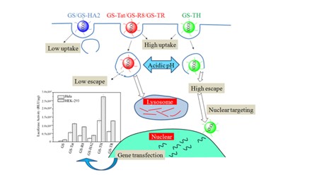 (1)采用2步sol-gel以明胶和硅烷为基础构建出阳离子型的明胶-硅氧烷纳米颗粒(GSNPs,粒径:~ 150 nm,表面电位:~ +25 mV);并可将具有不同功能的穿膜肽、融合肽、核定位肽、线粒体靶向肽等接枝到GSNPs表面。我们的研究发现穿膜肽Tat在细胞内化、核定位等方面起主要作用,而融合肽HA2在逃逸溶酶体上起关键作用。功能多肽修饰的GSNPs可负载并保护质粒DNA,同时修饰Tat和HA2的GSNP可以最大地增强负载基因的基因转染能力。