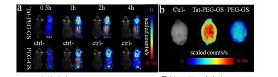 通过化学方法将穿膜肽Tat、SynB以及肿瘤靶向适配体AGO100分别修饰于明胶-硅氧烷纳米粒子(GS)。研究发现修饰有Tat及SynB的GS纳米粒子能跨过BBB;而在AGO100适配体的介导下,纳米材料能有效靶向肿瘤组织。
