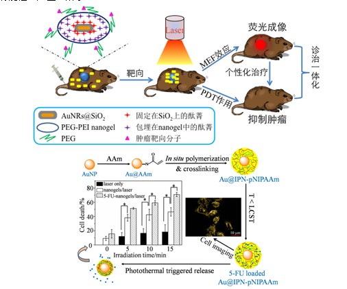 恶性肿瘤是常见且严重威胁人类健康和生命的重大疾病之一,如何实现高灵敏、高分辨的肿瘤影像诊断为肿瘤治疗提供有效信息是目前癌症治疗的一大难题。光动力疗法(Photodynamic therapy, PDT)是一种治疗恶性肿瘤的新方法。PDT的核心要素是光敏剂。电子激发态光敏剂不仅能在特定波长光的激发下,将吸收的光子能量传递给氧,产生一些中间活性物质而杀死肿瘤,还有可能在转变为基态过程时发出荧光。近年来,随着临床诊断成像设备(如腹腔镜、膀胱镜、内窥镜,以及神经外科显微镜)的成熟,在肿瘤的PDT过程中同时进行光敏剂荧光诊断(photosensitizer fluorescence detection,PFD),以提高治疗的靶向性及预后效果也受到越来越多的重视,并将为肿瘤的“精确定位、精确治疗”提供重要保障。我们将纳米化光敏剂的“PDT”和“PFD”策略相结合,利用纳米金棒的可调LSPR性质,以及纳米水凝胶对光敏剂药物的高负载能力,对光敏剂递送体系的组成和结构进行合理设计、优化和整合,构筑一种新型智能纳米光敏剂递送系统,从而实现长循环、可视化、靶向治疗等多功能性(如图1所示)。
