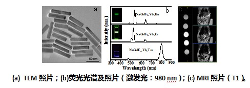 (1)通过便捷、环保的微波辅助水热合成法快速制备形貌均一、形貌可控并兼具上转换荧光/顺磁性双功能的β-NaGdF4:Yb,Er(Tm/Ho)纳米晶。通过改变掺杂稀土元素的种类和掺杂比例可以得到从近红外到近紫外波段内的多色发射光。由于在该荧光体基质中掺入磁性的稀土元素Gd,该纳米探针有望应用于MRI和荧光标记结合的双模式检测领域。